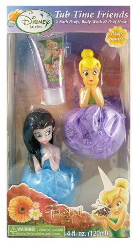 Tinkerbell Tub Time Friends Gift Set - Includes 2 Bath Poufs & Body Wash. This 3 piece set includes one Tinkerbell bath pouf, one Fairy bath pouf, and a 1 fluid ounce mango scented body wash.Bath pouf squirts water!