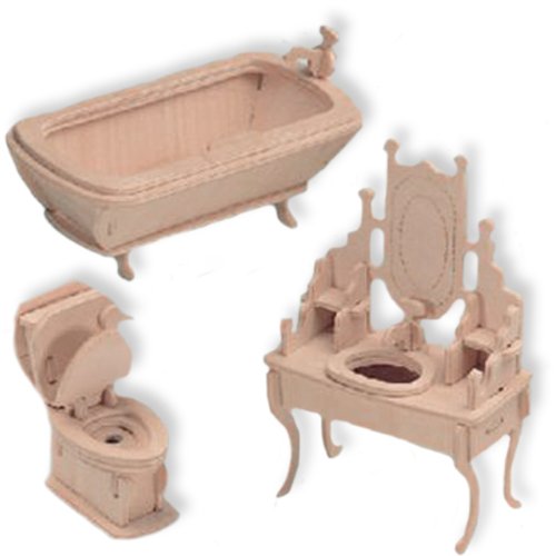 This is a Woodcraft Construction Kit of a Bathroom Furniture Set to be used for a Doll House. The furniture is at 1/4 scale. These Woodcraft Construction Kits are 3D wooden puzzle marvels for kids of all ages. Not only are they fun to put together, but they are also educational and bring out the creativity of those working on them. The units are made of 3mm plywood and the pieces are individually slotted to interlock with one another to form a 3D model. Everything is pre-cut and assembled by pushing the pieces together. There is nothing to cut or glue. The 3D Puzzles are even paintable if desired.