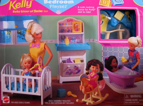 Kelly, Baby Sister of Barbie Doll, Bedroom Playset # 67716-91 is a 1998 Arcotoys, Inc./Mattel Company production. PLAYSET CONTENTS: Bathtub, Crib, a Rocking Horse, a Changing Table, a Picture Frame & Accessories. ADULT ASSEMBLY REQUIRED. Playset included items are pretend & intended for Kelly & 4.5" fashion dolls; NO Dolls & NO Curtains are included with this Playset. For Ages 3+ Years. Warning: Choking Hazard due to small parts. NOT recommended for children under Age 3 years or children who still put objects in their mouth. All provided information is to the best of my ability & may not be exact; colors, styles, sizes & information may vary. Kelly Bedroom Playset, a 1998 Arcotoys, Inc. A Mattel Company production is great for any collection or just for fun play! For Box Condition see CONDITION NOTE or Email Seller for Details.