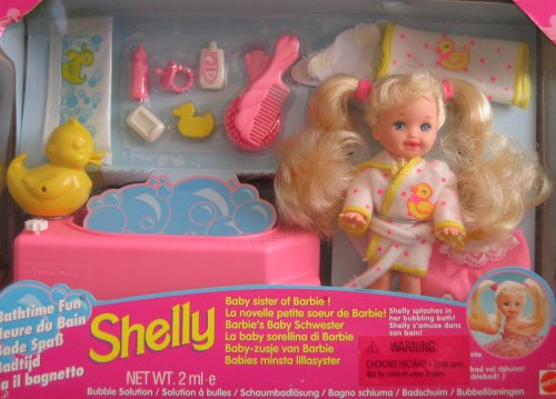 Bathtime Fun Shelly Doll, Baby Sister of Barbie! is a 1995 Mattel production playset. Model #14552. Box is multi lingual w/English, Spanish, French and more. Contents include: Shelly doll that's approx. 4.5" tall with long blond pigtails. Shelly wears a white Bath Robe w/yellow Ducks outlined in pink & pink dots pattern; Bath Robe has Belt at waist. Shelly comes with a pink Bath Tub approx. 4.5", Bubble Solution Net WT. 2ml e to make water bubble; Bubble Solution is a 1 time use only. Also included is a yellow plastic Duckie approx. 1.5", a pink Onesie Outfit that has white lace trim & white piece at top & there's a Towel that matches the Bath Robe. There are other accessories such as: Pacifier, Soap, Baby Bottle, yellow Duck Sponge, Lotion Bottle, Comb & Brush & there's also a Diaper. The Bath Really Bubbles! To make Bath Bubble, put the Bubble Solution into the Bath water, then take the Yellow Duckie and squeeze the duck & the water will bubble. Shelly Really Splashes! To make Shelly Doll Splash, press the lever on Shelly's back to make her arms go up & down, & her arms will splash in the water. Baby Bottle & Pacifier fit into Shelly doll's mouth. All items included are pretend & intended for Shelly & 4.5" size dolls; except bubble solution. Bubble solution is a one time use only. All included items are pretend & Kelly doll size. All descriptions & information provided are to the best of my ability and may not be exact. WARNING: Choking Hazard/Small Parts; For Ages 3+ Years. Bathtime Fun Shelly, Baby Sister of Barbie, a 1995 Mattel production is great for any collection, as a gift or just for fun play!